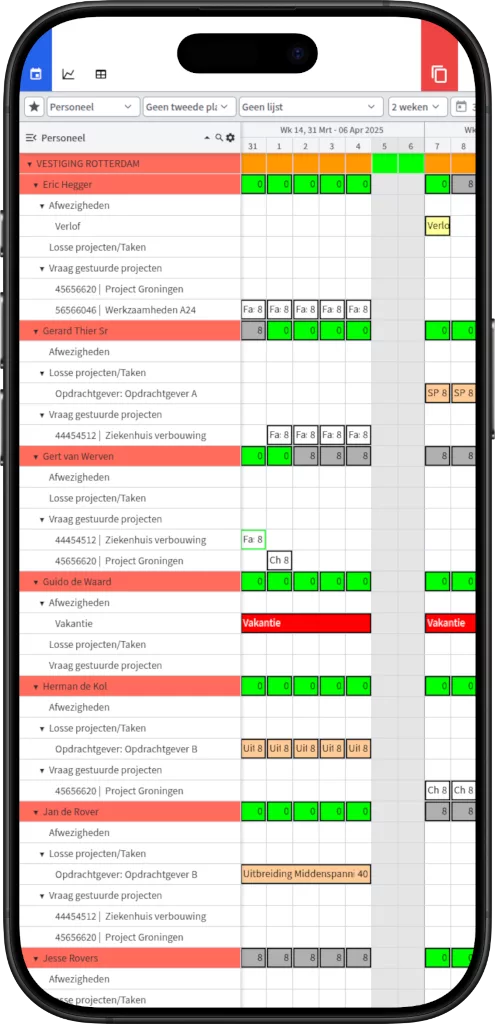 Planning.nl offers a complete planning tool that allows you to combine project planning and resource planning on a single planning board. We develop our software ourselves, and it runs on our own hardware from data centres in the Netherlands.
